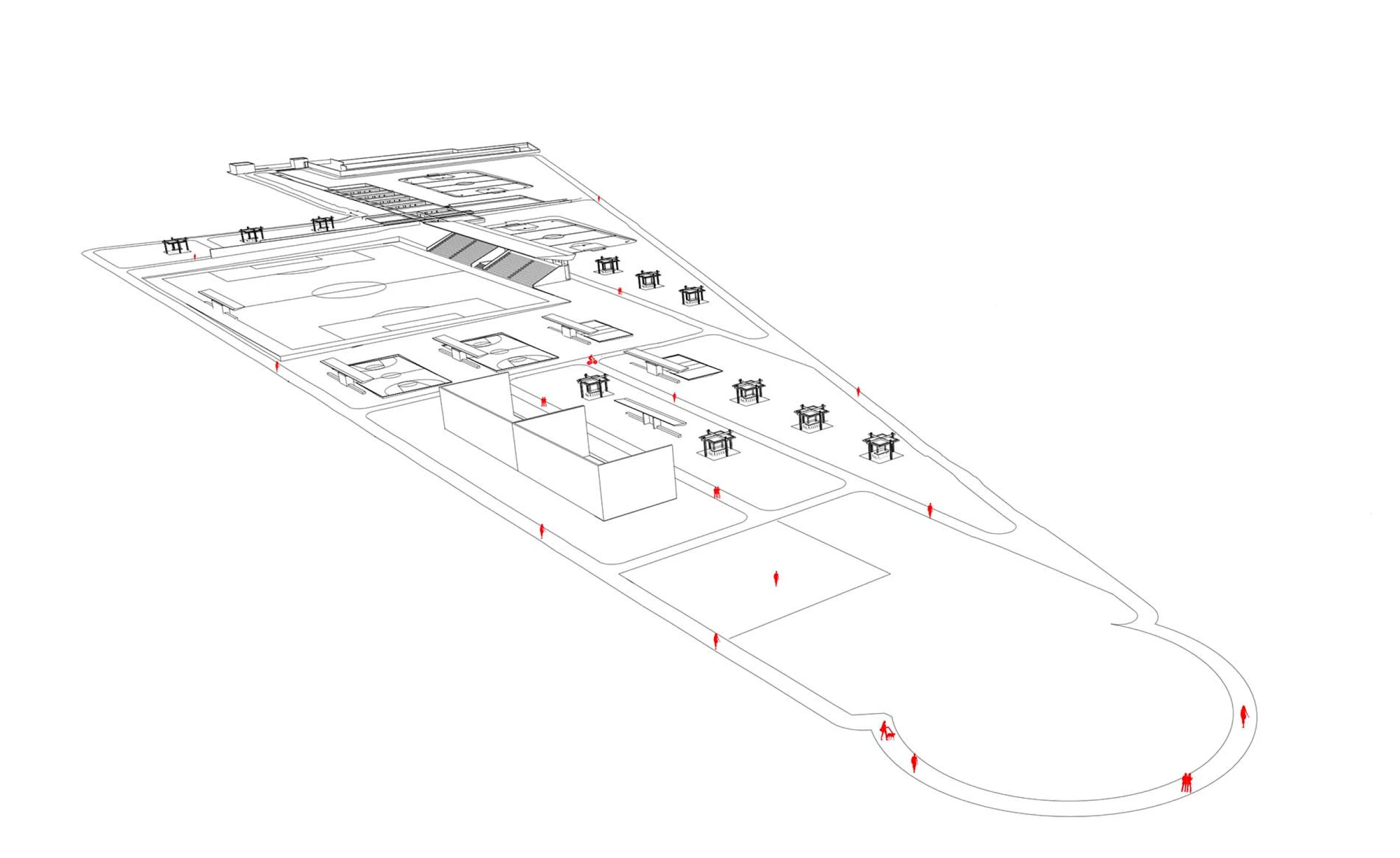 Además, incluye la construcción de gimnasios, tanto al aire libre como techados, áreas para actividades como yoga y pilates, y elementos de infraestructura como casetas de vigilancia, tiendas, kioscos y sistemas de instalación eléctrica, sanitaria y pluvial. Todo ello con una planificación cuidadosa de iluminación y espacios que favorezcan la funcionalidad y la experiencia del usuario.